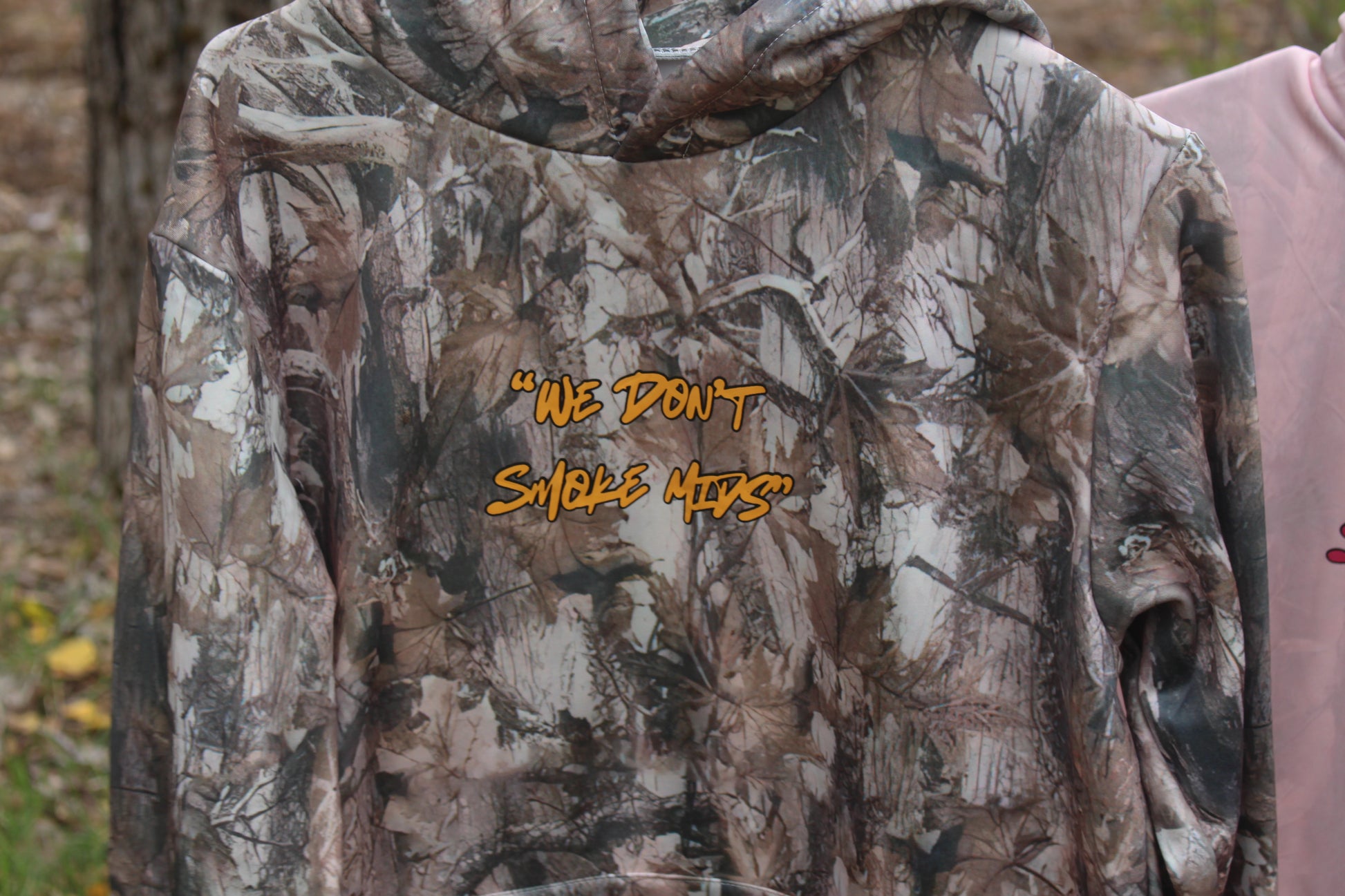 “We Don’t Smoke Mids” camouflage hoodie available in pink and regular camouflage. These hoodies are water resistant and perfect for your outdoor adventures. 95% polyester 5 % spandex.